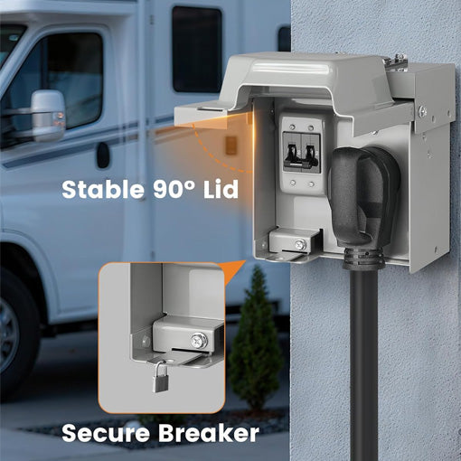 ✅ Safe & Reliable Power: Overloaded circuits and faulty outlets can ruin your travel plans. This outlet box features a built-in breaker that protects your RV and EV, automatically shutting off power during surges or overloads. Its lockable design ensures safety in public areas while providing worry-free electricity.