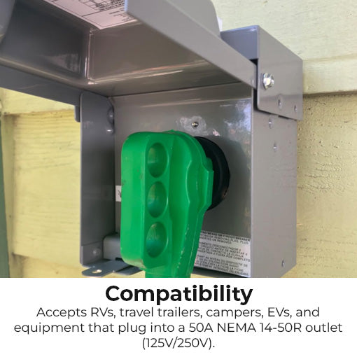 Compatibility: NEMA 50 AMP 125V/250V 14-50R receptacle; works with RVs, campers, travel trailers, and EV charging